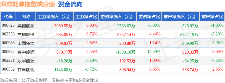 资金流向方面,深成能源(399680)指数成份股当日主力资金净流入合计4173.24万元,游资资金净流入合计2882.95万元,散户资金净流出合计7056.2万元。成份股资金流向详情见下表: