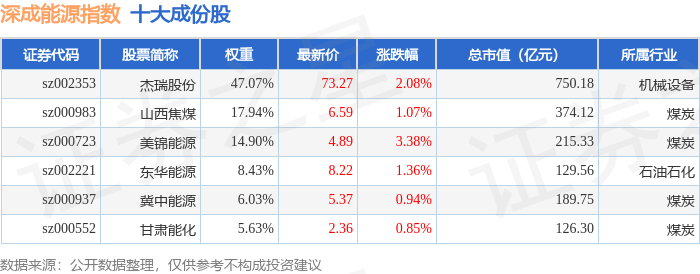 证券之星消息,1月6日,深成能源(399680)指数报收于779.87点,涨1.89%,成交23.77亿元,换手率1.32%。当日该指数成份股中,上涨的有6家,美锦能源以3.38%的涨幅领涨。