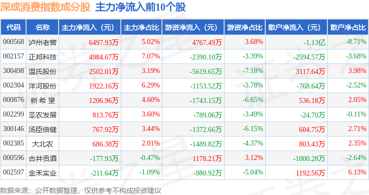 资金流向方面,深成消费(399684)指数成份股当日主力资金净流出合计5594.6万元,游资资金净流出合计1.28亿元,散户资金净流入合计1.84亿元。成份股资金流向详情见下表:
