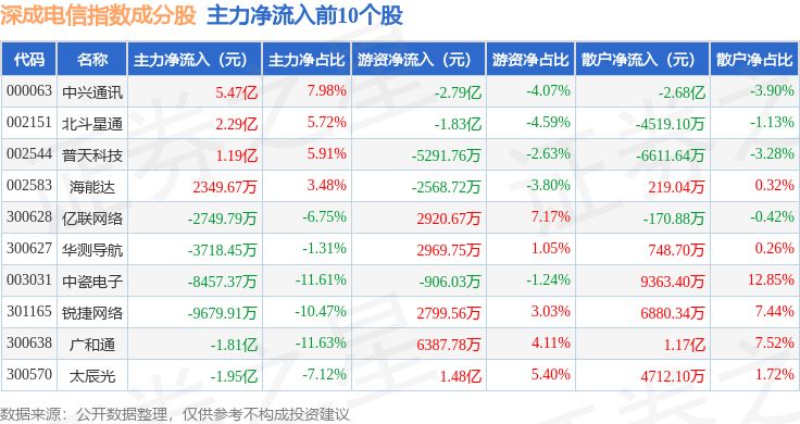 资金流向方面,深成电信(399688)指数成份股当日主力资金净流出合计74.48亿元,游资资金净流入合计52.07亿元,散户资金净流入合计22.4亿元。成份股资金流向详情见下表: