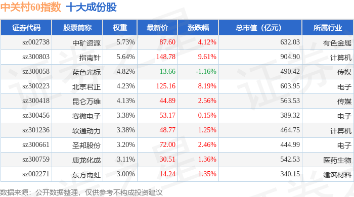 中关村60(399697)指数十大成份股详情如下: