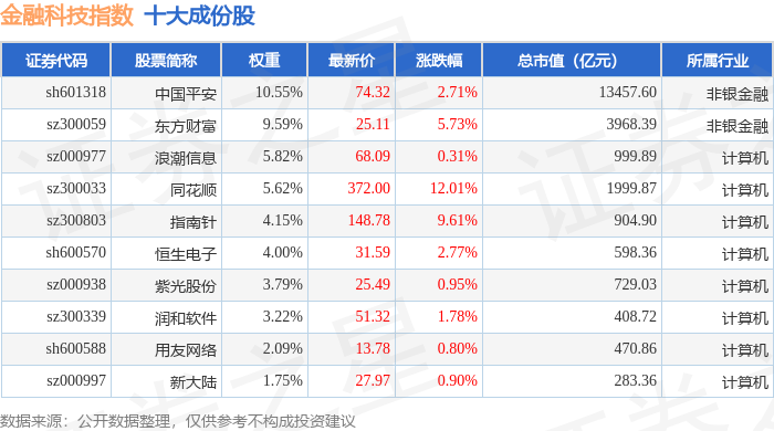金融科技(399699)指数十大成份股详情如下: