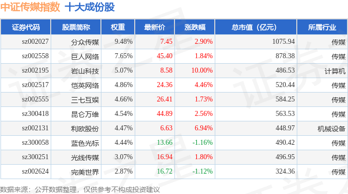 证券之星消息,1月6日,中证传媒(399971)指数报收于1567.24点,涨1.99%,成交740.25亿元,换手率6.27%。当日该指数成份股中,上涨的有38家,岩山科技以10.0%的涨幅领涨,下跌的有9家,易点天下以4.24%的跌幅领跌。