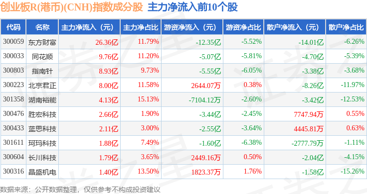 资金流向方面,创业板R(港币)(CNH)(470006)指数成份股当日主力资金净流出合计63.74亿元,游资资金净流入合计32.74亿元,散户资金净流入合计31.0亿元。成份股资金流向详情见下表: