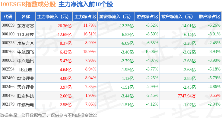 资金流向方面,100ESGR(470027)指数成份股当日主力资金净流入合计11.05亿元,游资资金净流出合计4.07亿元,散户资金净流出合计6.97亿元。成份股资金流向详情见下表: