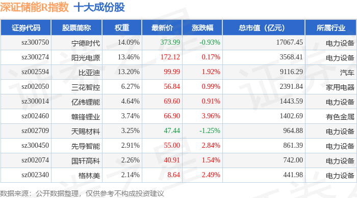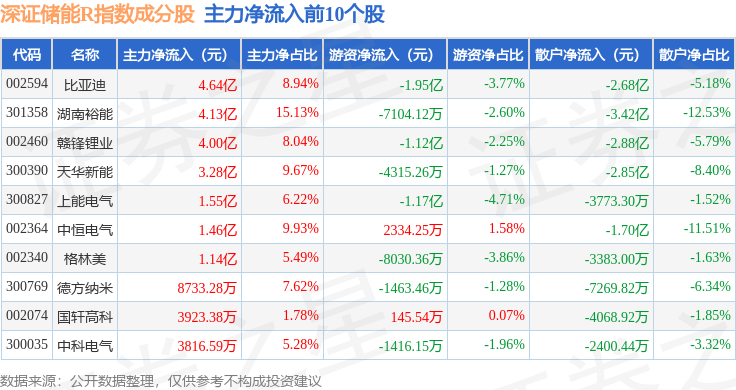 资金流向方面,深证储能R(470036)指数成份股当日主力资金净流出合计17.76亿元,游资资金净流入合计6.21亿元,散户资金净流入合计11.56亿元。成份股资金流向详情见下表: