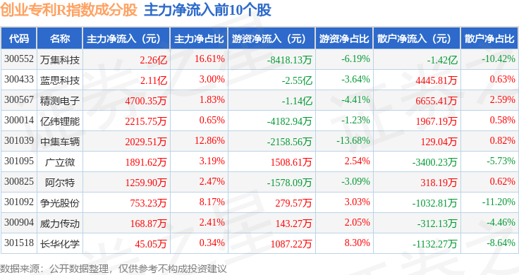 资金流向方面,创业专利R(470068)指数成份股当日主力资金净流出合计33.6亿元,游资资金净流入合计4.93亿元,散户资金净流入合计28.67亿元。成份股资金流向详情见下表: