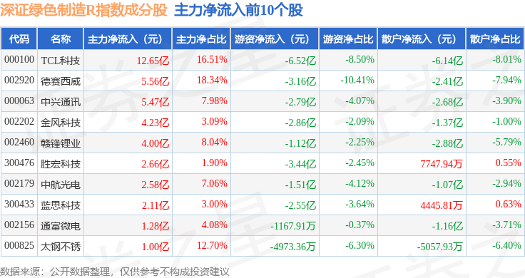 资金流向方面,深证绿色制造R(470069)指数成份股当日主力资金净流入合计13.95亿元,游资资金净流出合计22.87亿元,散户资金净流入合计8.92亿元。成份股资金流向详情见下表: