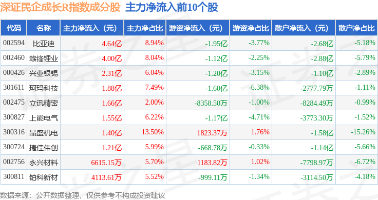 资金流向方面,深证民企成长R(470071)指数成份股当日主力资金净流出合计77.14亿元,游资资金净流入合计52.8亿元,散户资金净流入合计24.33亿元。成份股资金流向详情见下表: