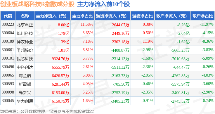 资金流向方面,创业板战略科技R(471004)指数成份股当日主力资金净流入合计1.91亿元,游资资金净流入合计9593.56万元,散户资金净流出合计2.87亿元。成份股资金流向详情见下表: