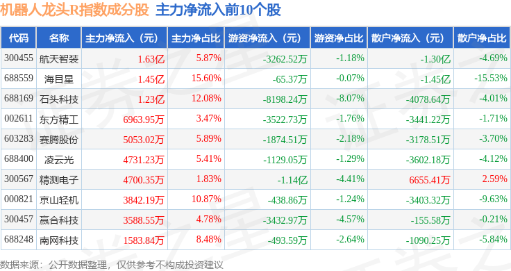 资金流向方面,机器人龙头R(480071)指数成份股当日主力资金净流出合计17.43亿元,游资资金净流入合计7413.97万元,散户资金净流入合计16.69亿元。成份股资金流向详情见下表: