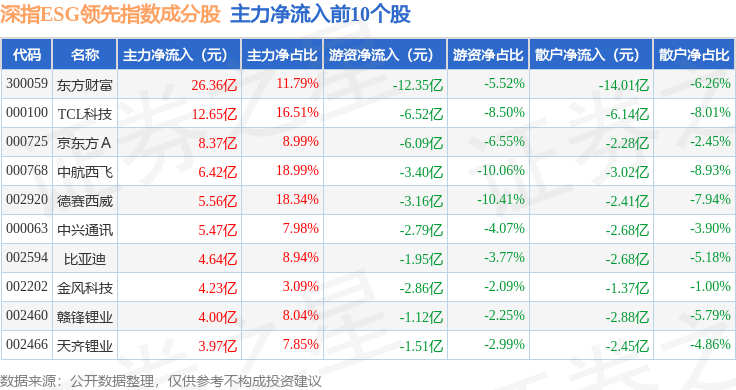 资金流向方面,深指ESG领先(970029)指数成份股当日主力资金净流入合计6.47亿元,游资资金净流出合计14.9亿元,散户资金净流入合计8.44亿元。成份股资金流向详情见下表: