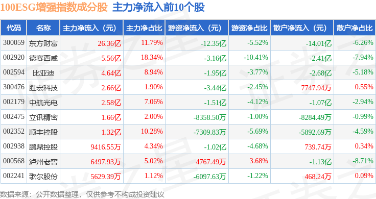 资金流向方面,100ESG增强(970033)指数成份股当日主力资金净流出合计7.28亿元,游资资金净流入合计8.83亿元,散户资金净流出合计1.55亿元。成份股资金流向详情见下表: