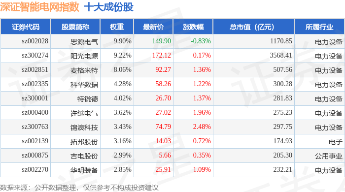 深证智能电网(970054)指数十大成份股详情如下:
