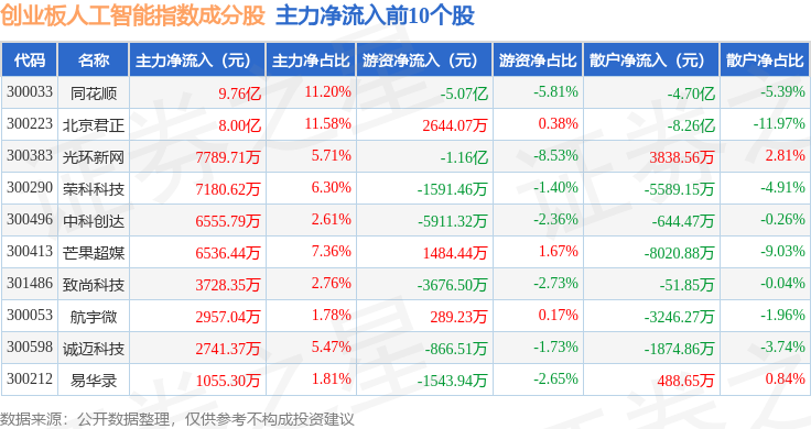 资金流向方面,创业板人工智能(970070)指数成份股当日主力资金净流出合计84.88亿元,游资资金净流入合计50.37亿元,散户资金净流入合计34.51亿元。成份股资金流向详情见下表: