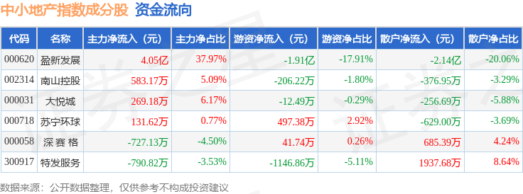 资金流向方面,中小地产(971002)指数成份股当日主力资金净流入合计4.0亿元,游资资金净流出合计1.99亿元,散户资金净流出合计2.0亿元。成份股资金流向详情见下表: