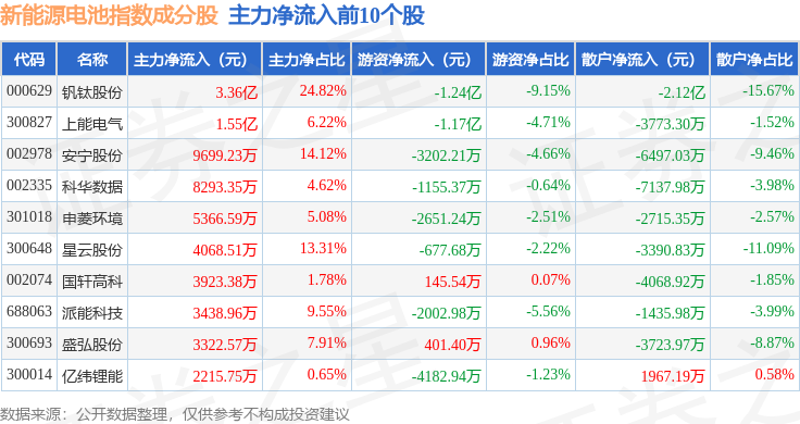 资金流向方面,新能源电池(980027)指数成份股当日主力资金净流出合计22.4亿元,游资资金净流入合计6.84亿元,散户资金净流入合计15.55亿元。成份股资金流向详情见下表: