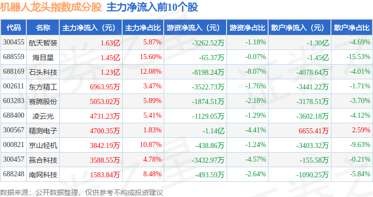 资金流向方面,机器人龙头(980071)指数成份股当日主力资金净流出合计17.43亿元,游资资金净流入合计7413.97万元,散户资金净流入合计16.69亿元。成份股资金流向详情见下表: