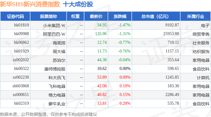 新华SHS新兴消费(989006)指数十大成份股详情如下: