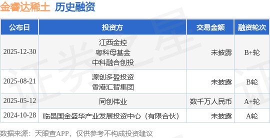证券之星消息,根据天眼查APP于12月30日公布的信息整理,山东金睿达稀土新材料有限公司B+轮融资,融资额未披露,参与投资的机构包括江西金控,粤科母基金,中科融合创投。
