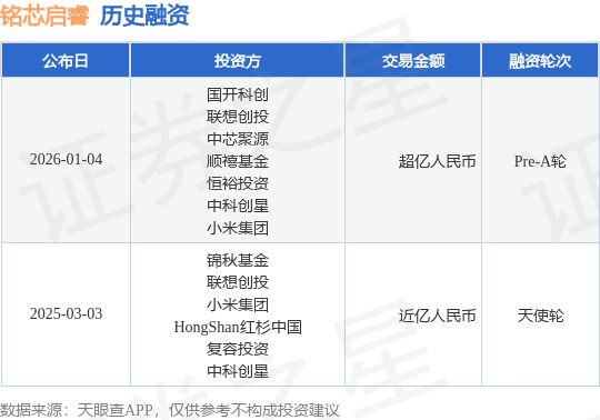 证券之星消息,根据天眼查APP于1月4日公布的信息整理,北京铭芯启睿科技有限公司Pre-A轮融资,融资额超亿人民币,参与投资的机构包括国开科创,联想创投,中芯聚源,顺禧基金,恒裕投资,中科创星,小米集团。