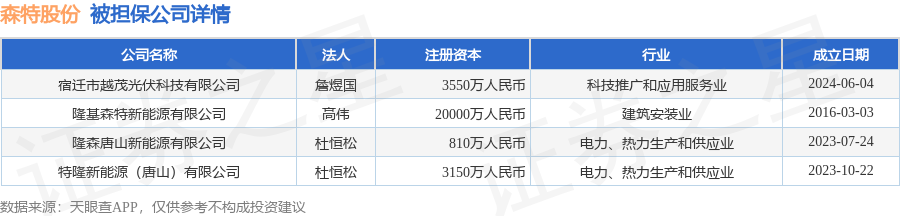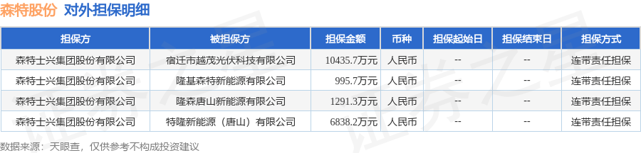 森特股份1月5日披露4笔对外担保,被担保公司4家。对外担保明细如下表: