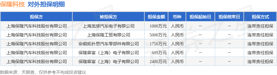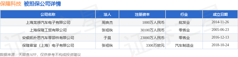 保隆科技1月5日披露5笔对外担保,被担保公司4家。对外担保明细如下表: