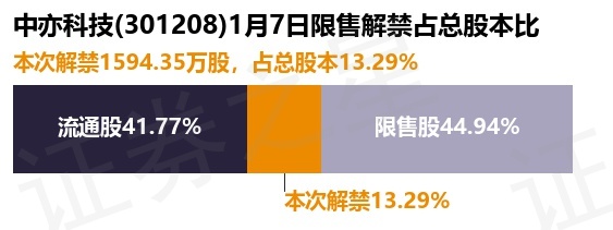 证券之星消息,根据市场公开信息整理,中亦科技(301208)于1月7日将有1594.35万股限售股份解禁,为公司追加承诺限售股份上市流通,占公司总股本13.29%。(本次数据根据历史公告整理得出,实际情况以上市公司最新公告为准)最近一年内,该股累计解禁61.2万股,占总股本的0.51%。本次解禁后,公司还有5392.8万股限售股份,占总股本44.94%。具体如下图所示: