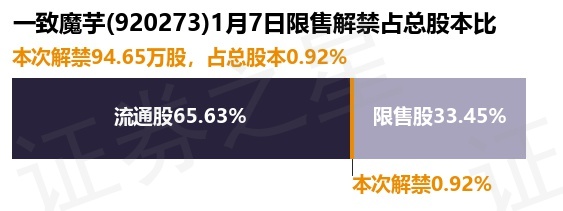 证券之星消息,根据市场公开信息整理,一致魔芋(920273)于1月7日将有94.65万股限售股份解禁,为公司股权激励限售股份,占公司总股本0.92%。(本次数据根据历史公告整理得出,实际情况以上市公司最新公告为准)本次解禁后,公司还有3451.77万股限售股份,占总股本33.45%。具体如下图所示: