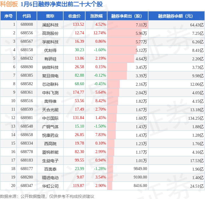 科创板融券净卖出前三分别为:澜起科技(688008)融券净卖出7.11万股、高测股份(688556)融券净卖出5.96万股、孚能科技(688567)融券净卖出5.77万股,前20具体见下表: