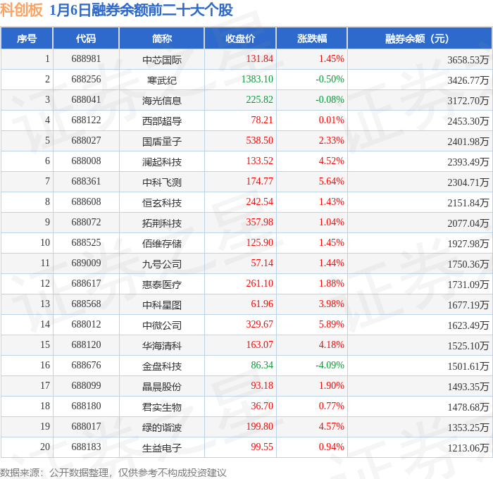 科创板融券余额前三分别为:中芯国际(688981)融券余额3658.53万元、寒武纪(688256)融券余额3426.77万元、海光信息(688041)融券余额3172.7万元,前20具体见下表: