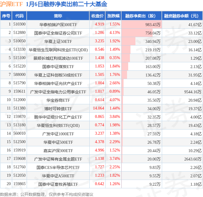 沪深ETF融券净卖出前三分别为:华泰柏瑞沪深300ETF(510300)融券净卖出983.43万股、国泰中证全指证券公司ETF(512880)融券净卖出758.04万股、华夏上证50ETF(510050)融券净卖出340.94万股,前20具体见下表: