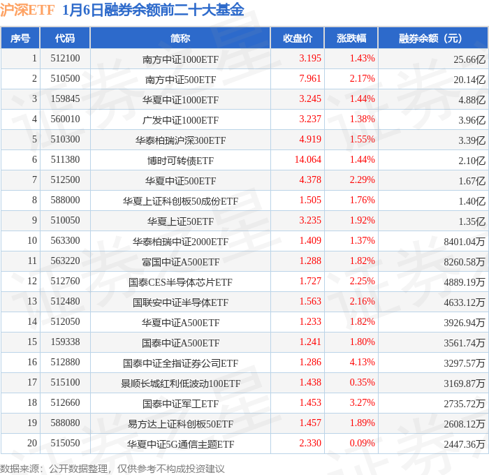 沪深ETF融券余额前三分别为:南方中证1000ETF(512100)融券余额25.66亿元、南方中证500ETF(510500)融券余额20.14亿元、华夏中证1000ETF(159845)融券余额4.88亿元,前20具体见下表: