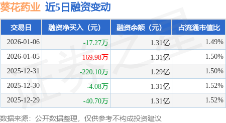 证券之星消息,1月6日,葵花药业(002737)融资买入315.83万元,融资偿还333.11万元,融资净卖出17.27万元,融资余额1.31亿元。