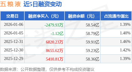 证券之星消息,1月6日,五 粮 液(000858)融资买入1.42亿元,融资偿还1.66亿元,融资净卖出2479.93万元,融资余额58.54亿元。