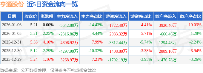 1月6日的资金流向数据方面,主力资金净流出5642.8万元,占总成交额14.43%,游资资金净流入1722.4万元,占总成交额4.41%,散户资金净流入3920.4万元,占总成交额10.03%。