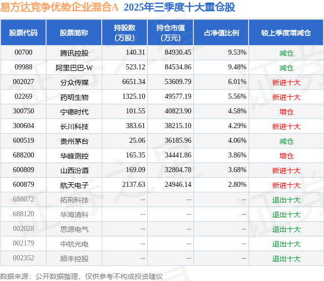 易方达竞争优势企业混合A的前十大重仓股如下: