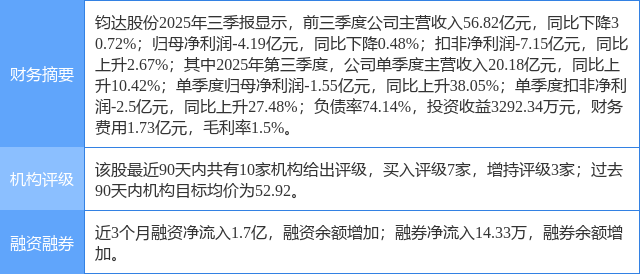 2025年12月23日,国金证券研究员姚遥发布了对钧达股份的研报《掘金万亿市场,打造太空光伏引领者》,该研报对钧达股份给出“买入”评级。研报中预计2025-2027年公司归母净利润预测至-5.58/5.77/10.20亿元,维持“买入”评级。证券之星数据中心根据近三年发布的研报数据计算,该研报作者对此股的盈利预测准确度为76.6%。