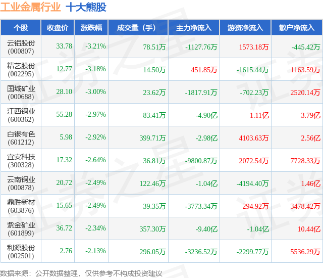 个股表现方面,工业金属行业当日领跌股为云铝股份(000807),该股当日报收33.78,下跌3.21%,成交量78.51万,主力资金净流出1127.76万元。精艺股份(002295)以下跌3.18%紧随其后,该股当日成交量14.5万,主力资金净流入451.85万元。除此之外,国城矿业(000688)、江西铜业(600362)、白银有色(601212)均进入当日熊股之列。具体个股列表见下表: