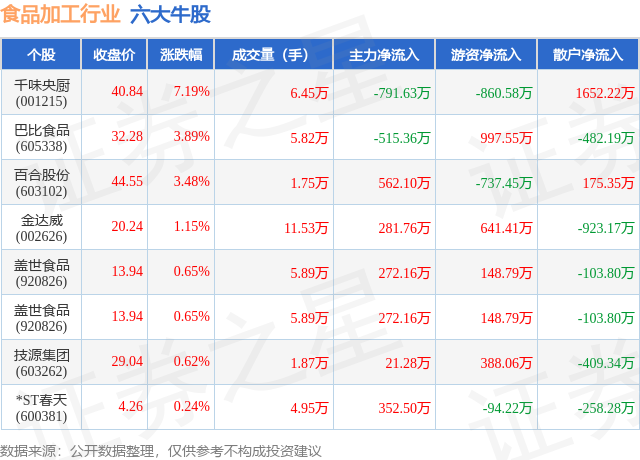 个股表现方面,食品加工行业当日领涨股为千味央厨(001215),该股当日报收40.84,上涨7.19%,成交量6.45万,主力资金净流出791.63万元。巴比食品(605338)以上涨3.89%紧随其后,该股当日成交量5.82万,主力资金净流出515.36万元。除此之外,百合股份(603102)、金达威(002626)、盖世食品(920826)均进入当日牛股之列。具体个股列表见下表: