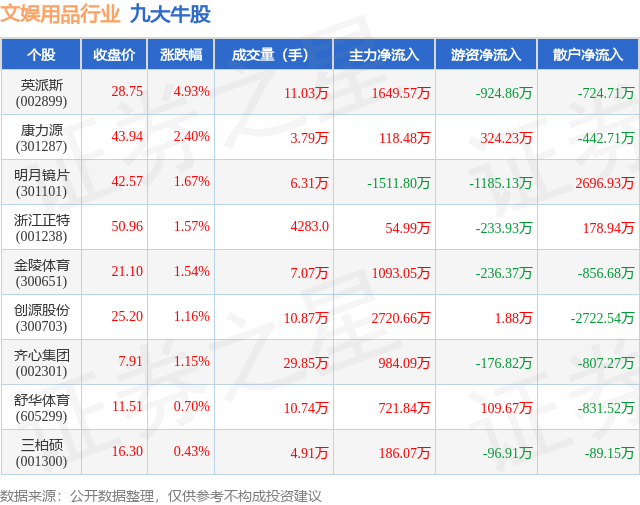 个股表现方面,文娱用品行业当日领涨股为英派斯(002899),该股当日报收28.75,上涨4.93%,成交量11.03万,主力资金净流入1649.57万元。康力源(301287)以上涨2.4%紧随其后,该股当日成交量3.79万,主力资金净流入118.48万元。除此之外,明月镜片(301101)、浙江正特(001238)、金陵体育(300651)均进入当日牛股之列。具体个股列表见下表: