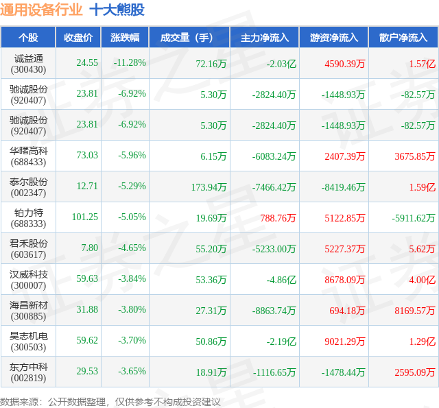 个股表现方面,通用设备行业当日领跌股为诚益通(300430),该股当日报收24.55,下跌11.28%,成交量72.16万,主力资金净流出2.03亿元。驰诚股份(920407)以下跌6.92%紧随其后,该股当日成交量5.3万,主力资金净流出2824.4万元。除此之外,驰诚股份(920407)、华曙高科(688433)、泰尔股份(002347)均进入当日熊股之列。具体个股列表见下表:
