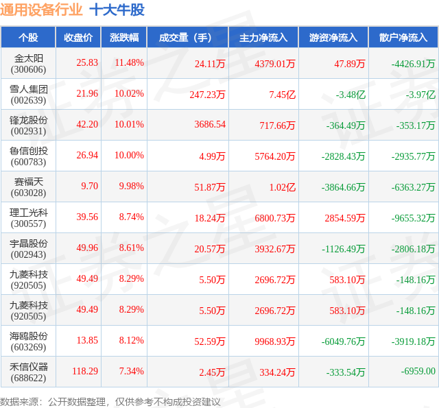 个股表现方面,通用设备行业当日领涨股为金太阳(300606),该股当日报收25.83,上涨11.48%,成交量24.11万,主力资金净流入4379.01万元。雪人集团(002639)以上涨10.02%紧随其后,该股当日成交量247.23万,主力资金净流入7.45亿元。除此之外,锋龙股份(002931)、鲁信创投(600783)、赛福天(603028)均进入当日牛股之列。具体个股列表见下表: