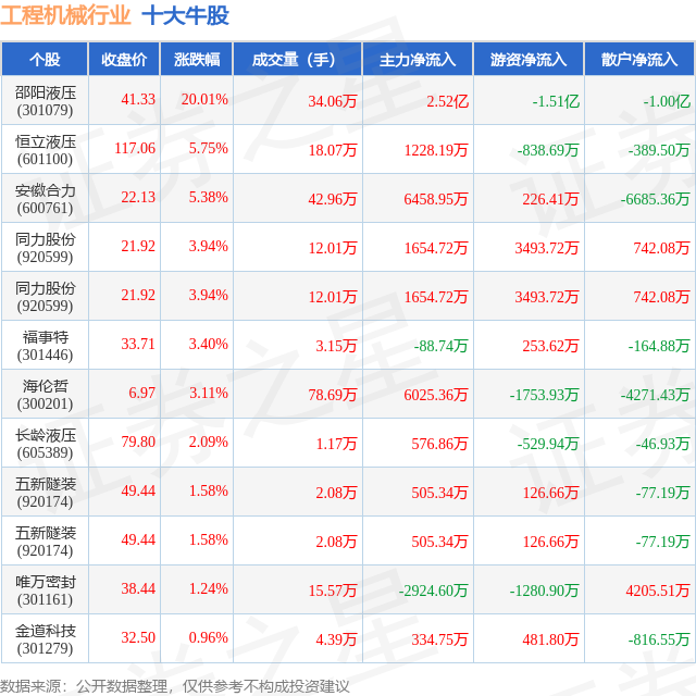 个股表现方面,工程机械行业当日领涨股为邵阳液压(301079),该股当日报收41.33,上涨20.01%,成交量34.06万,主力资金净流入2.52亿元。恒立液压(601100)以上涨5.75%紧随其后,该股当日成交量18.07万,主力资金净流入1228.19万元。除此之外,安徽合力(600761)、同力股份(920599)、同力股份(920599)均进入当日牛股之列。具体个股列表见下表: