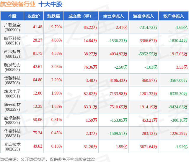 个股表现方面,航空装备行业当日领涨股为广联航空(300900),该股当日报收41.48,上涨9.79%,成交量85.22万,主力资金净流入2.41亿元。航亚科技(688510)以上涨4.66%紧随其后,该股当日成交量14.84万,主力资金净流出1536.23万元。除此之外,西部超导(688122)、航发动力(600893)、佳驰科技(688708)均进入当日牛股之列。具体个股列表见下表: