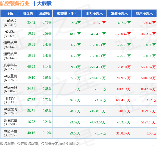 个股表现方面,航空装备行业当日领跌股为洪都航空(600316),该股当日报收35.42,下跌3.78%,成交量22.34万,主力资金净流入1021.2万元。爱乐达(300696)以下跌3.59%紧随其后,该股当日成交量18.1万,主力资金净流出4364.1万元。除此之外,通易航天(920642)、通易航天(920642)、航宇科技(688239)均进入当日熊股之列。具体个股列表见下表: