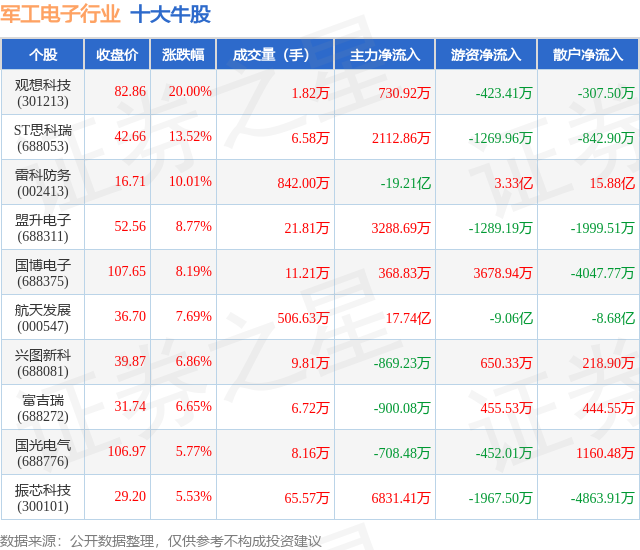 个股表现方面,军工电子行业当日领涨股为观想科技(301213),该股当日报收82.86,上涨20.0%,成交量1.82万,主力资金净流入730.92万元。ST思科瑞(688053)以上涨13.52%紧随其后,该股当日成交量6.58万,主力资金净流入2112.86万元。除此之外,雷科防务(002413)、盟升电子(688311)、国博电子(688375)均进入当日牛股之列。具体个股列表见下表: