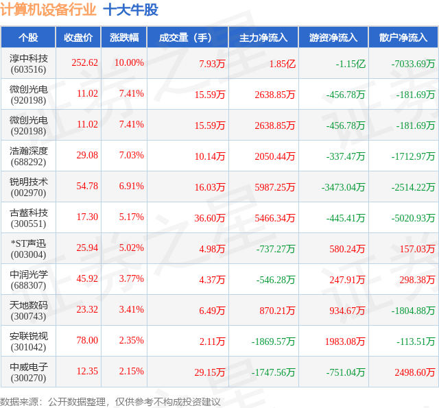 个股表现方面,计算机设备行业当日领涨股为淳中科技(603516),该股当日报收252.62,上涨10.0%,成交量7.93万,主力资金净流入1.85亿元。微创光电(920198)以上涨7.41%紧随其后,该股当日成交量15.59万,主力资金净流入2638.85万元。除此之外,微创光电(920198)、浩瀚深度(688292)、锐明技术(002970)均进入当日牛股之列。具体个股列表见下表: