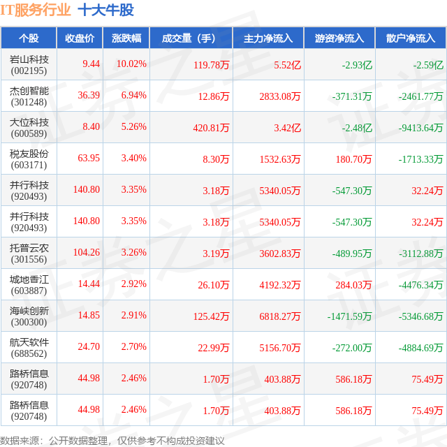 个股表现方面,IT服务行业当日领涨股为岩山科技(002195),该股当日报收9.44,上涨10.02%,成交量119.78万,主力资金净流入5.52亿元。杰创智能(301248)以上涨6.94%紧随其后,该股当日成交量12.86万,主力资金净流入2833.08万元。除此之外,大位科技(600589)、税友股份(603171)、并行科技(920493)均进入当日牛股之列。具体个股列表见下表: