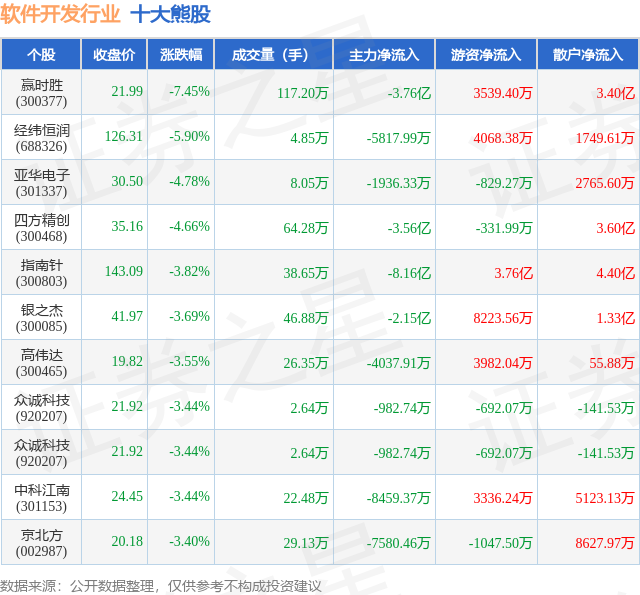 个股表现方面,软件开发行业当日领跌股为赢时胜(300377),该股当日报收21.99,下跌7.45%,成交量117.2万,主力资金净流出3.76亿元。经纬恒润(688326)以下跌5.9%紧随其后,该股当日成交量4.85万,主力资金净流出5817.99万元。除此之外,亚华电子(301337)、四方精创(300468)、指南针(300803)均进入当日熊股之列。具体个股列表见下表: